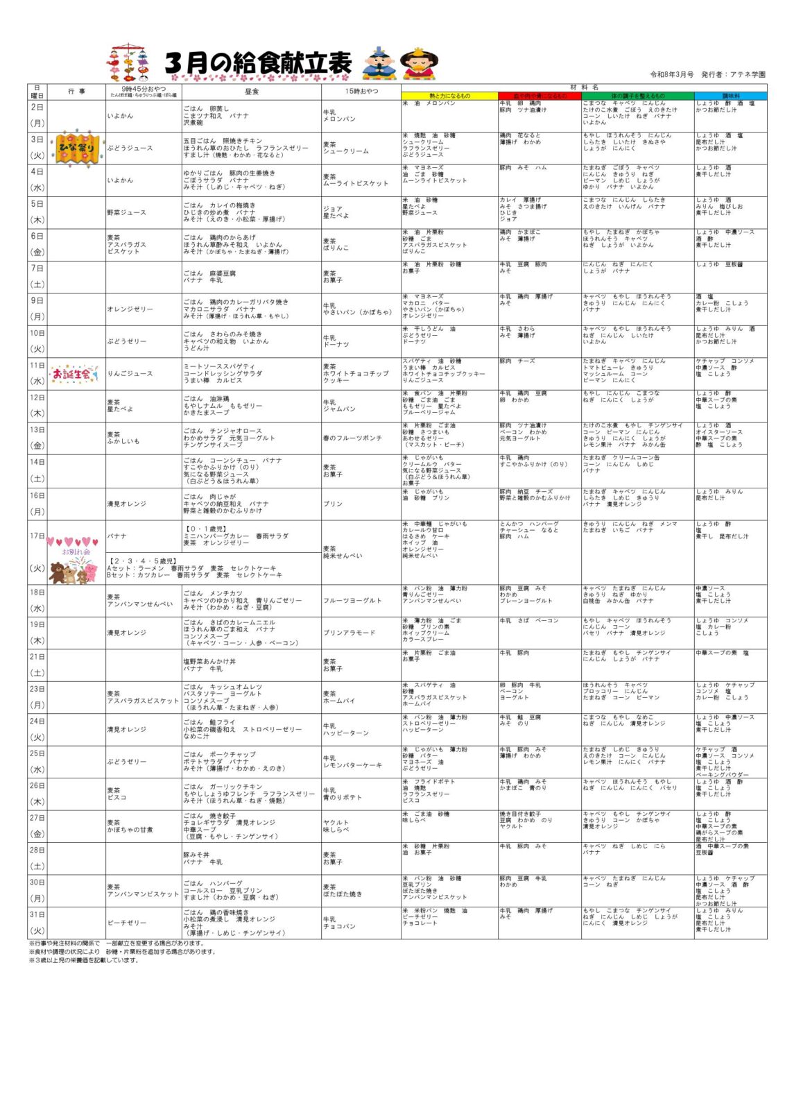 月1回特別献立のバースデーランチでは、「食べる楽しさ」を重視したスペシャルメニューで園児たちに好評です。 また、毎月食育の日があり、食に興味・関心が持てるような内容となっています。 0歳児は、ミルクからの流動食、離乳食とその園児の発達段階に合わせた献立を組みながらスムーズな普通食への移行を配慮しています。